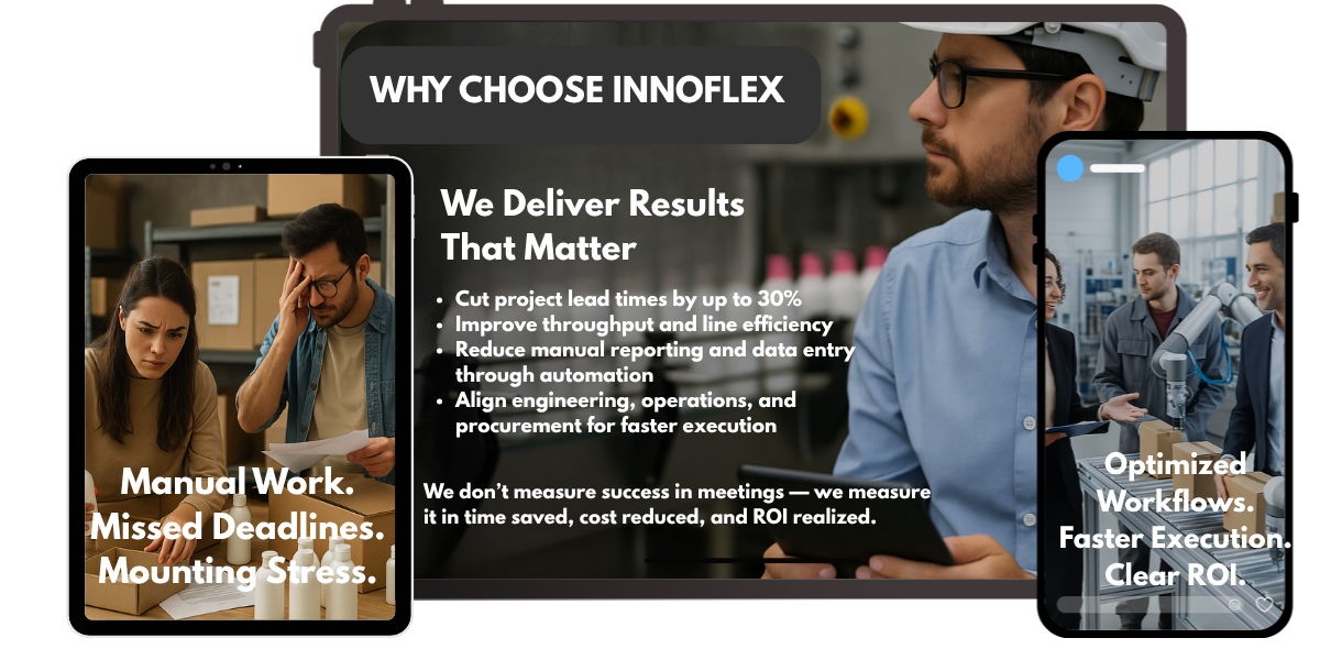 Most consulting firms stop at theory. InnoFlex starts where the real work begins — on the factory floor, in your engineering systems, and inside your packaging workflows.